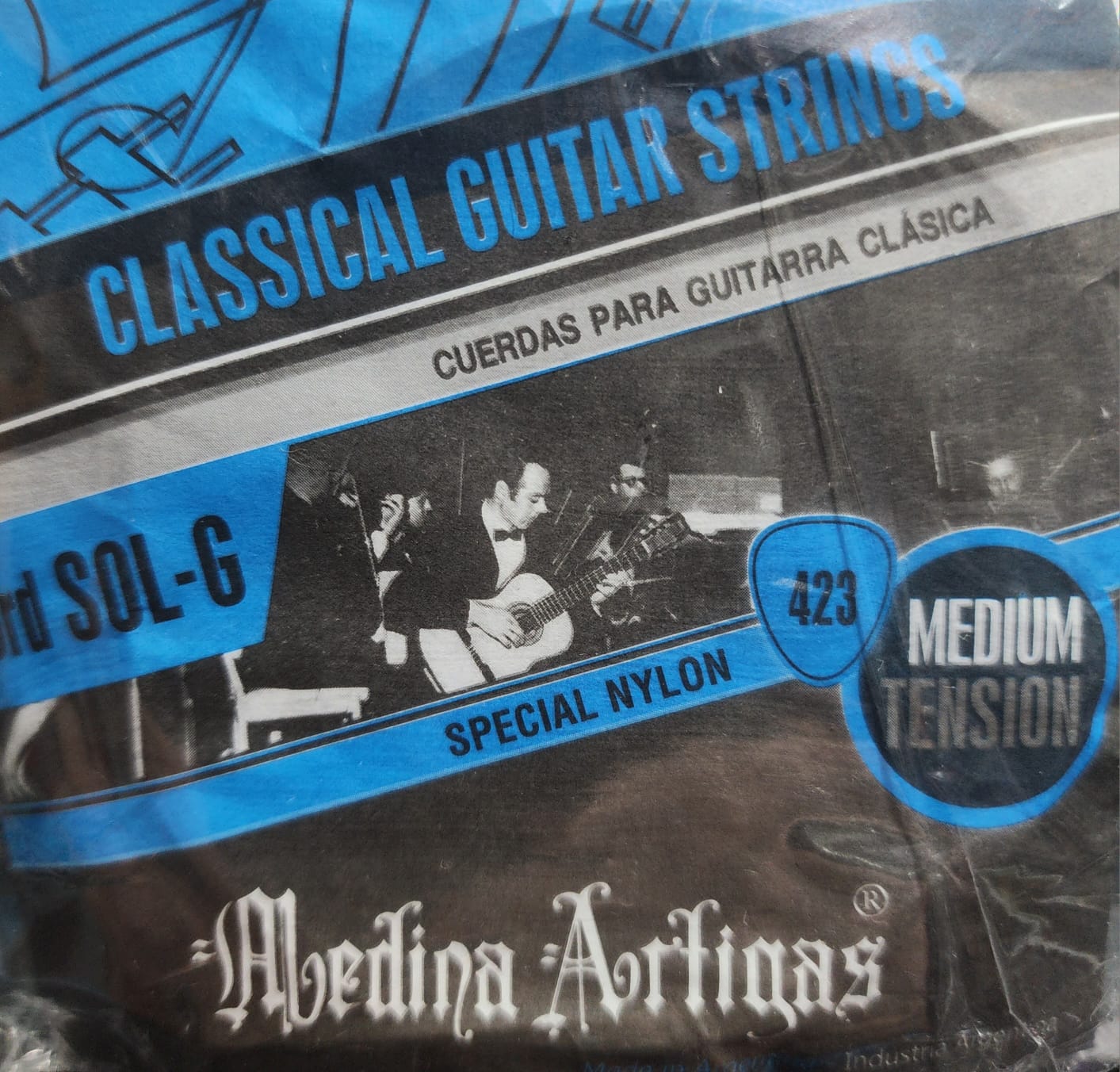 La cuerda suelta SOL (3ra) para guitarra clásica de Medina Artigas en sobre azul es de nylon con entorchado plateado y tensión media.