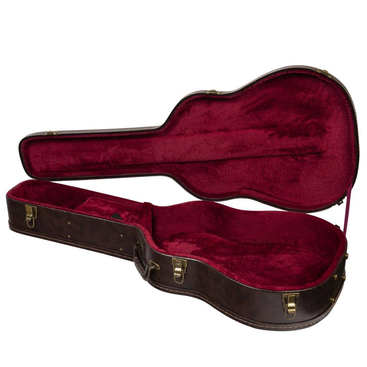 CompararEstuche de madera vintage para guitarra acústica/folk con revestimiento exterior de vinilo marrón y forro interior de suave terciopelo burdeos.