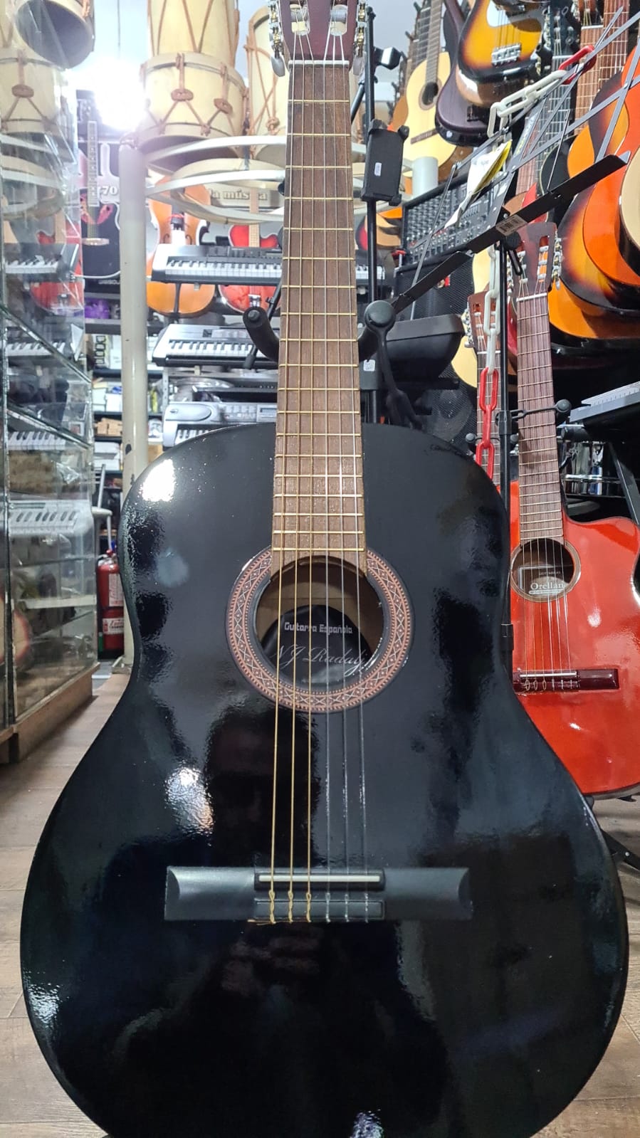 La guitarra criolla clásica nacional Radalj es una opción de estudio económica, ideal para principiantes, destacada por su buena relación precio-calidad. Construida con pino laminado en tapa y aros, mástil de cedro y cuerdas de nailon, ofrece un sonido cálido y aceptable. Incluye funda para transporte y está disponible en tamaños 4/4 (adultos) y menores (3/4 para niños)