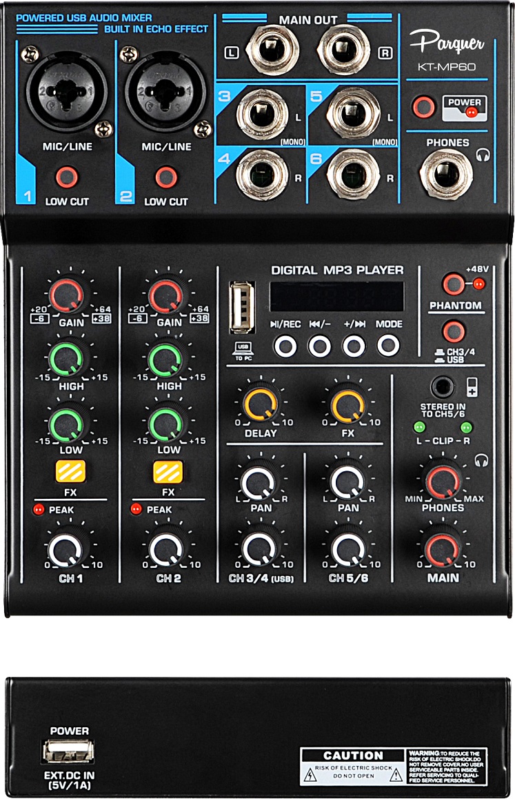 La Placa De Sonido Audio KTMP60 es una consola mezcladora e interfaz de audio de la marca Parquer con 6 canales, alimentación phantom de +48V y efectos de retardo (delay) incorporados. Es un dispositivo híbrido diseñado para músicos, creadores de contenido, streamers, podcasters y estudios caseros.